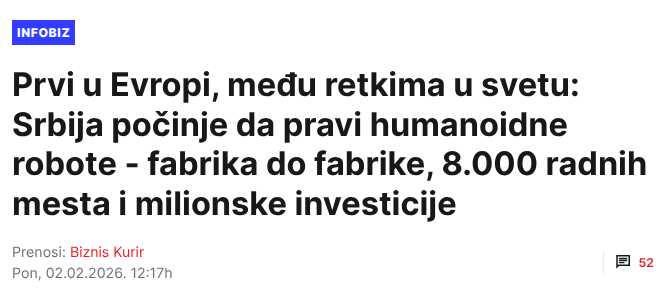 A fabrika delova za Boeing i Airbus? Brze pruge (rokovi) ? Mercedes autobusa? Kanalizacija za levu obalu Dunava(Borča, Ovča, Krnjača)?Beogradski metro? Roboti postoje, ali zasad samo tamo gde je i inače najviše „inovacija“ na plantažama marihuane. -
