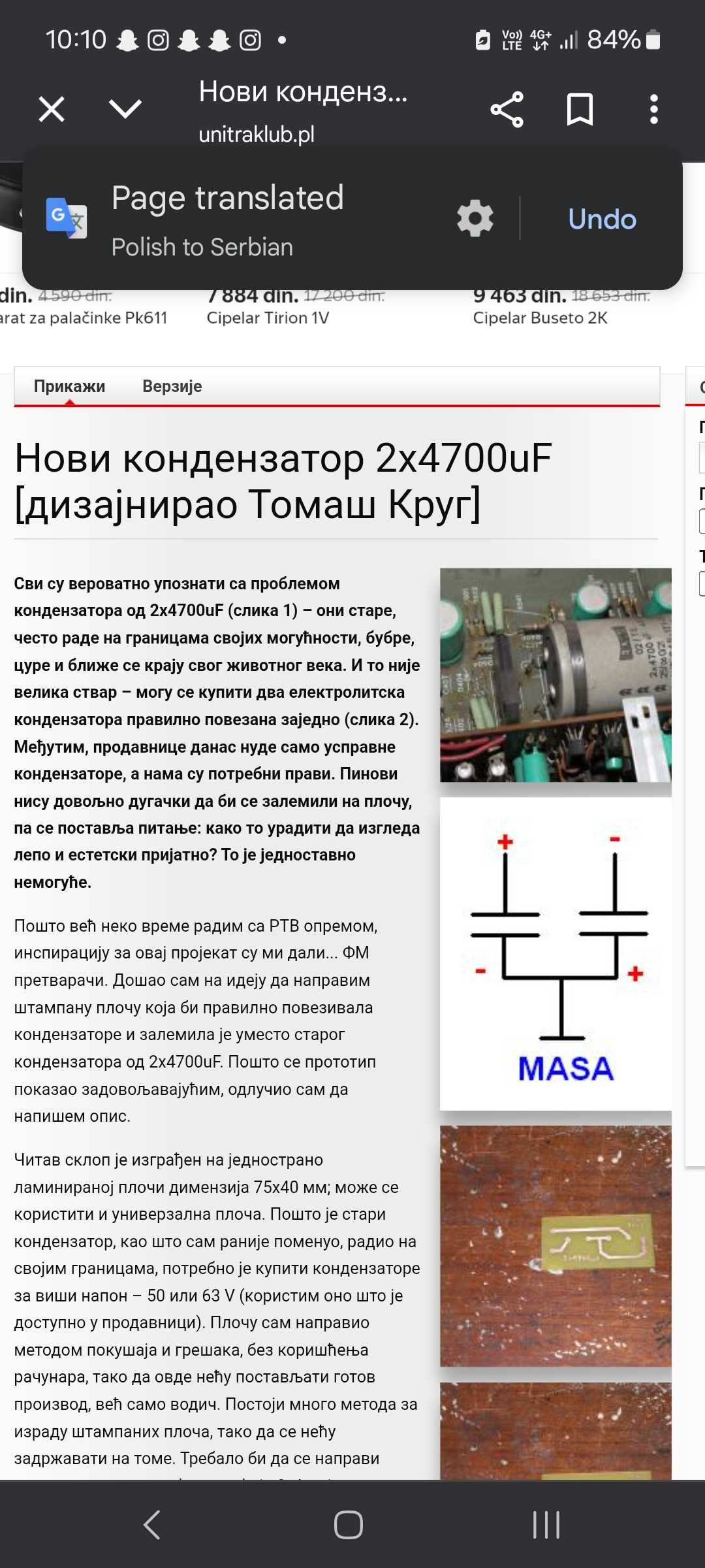Popravih unitrinu bagrziju. Ipak je bio problem dupli kondenzator 4700uf 40v. Naduvao se i probio. Kad sam gasio amp toliko je jako izbacivao zvucnike da vesanje oce da odvali, sad samo pucne. Naravno brujanje je skroz nestalo Ceo amp pitanje je kolko ce biti dugog veka al makar je iole lak za okrpiti Preporucujem svima koji imaju ovo pojacalo da izmene taj kondenzator za svaki slucaj, a uglavnom probije od starosti. Ja sam koristio 50v 4700uf, a evo i sheme kako se spaja P.s nadam se da do sada nije moglo nista da se osteti, izmenjeni su i u izlazima na oba kanala za svaki slucaj
