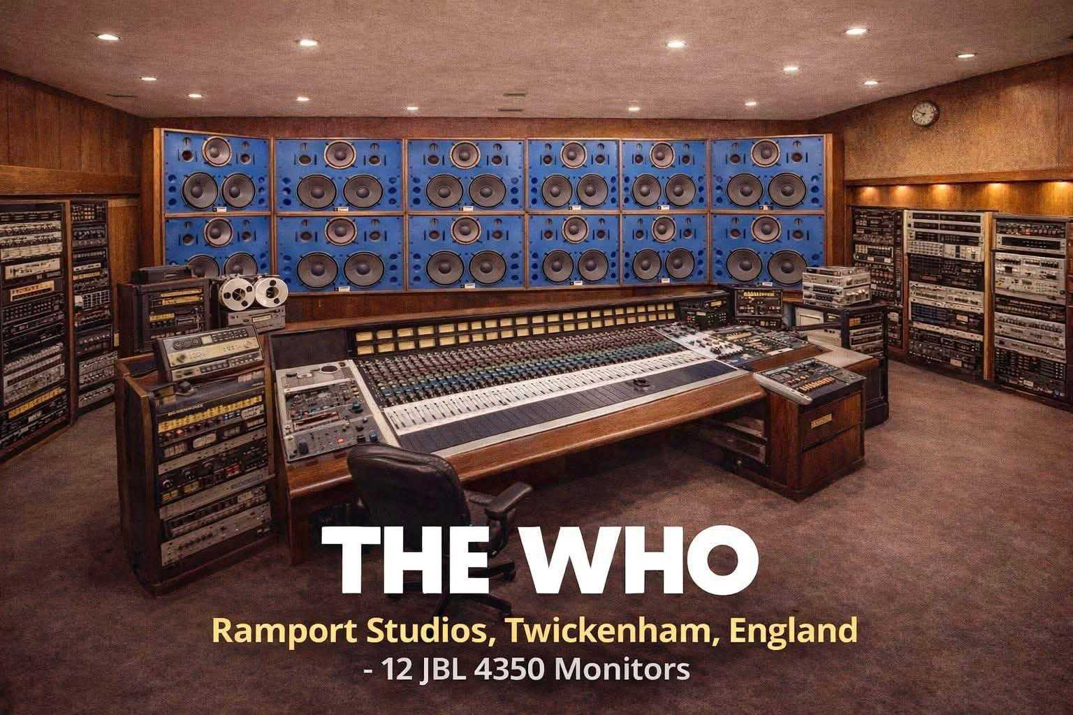 2. The British rock band The Who installed twelve JBL 4350 studio monitors in the control room of their Rampart Studios in Twickenham, England. This massive setup was used for monitoring and final mixdowns of master tapes during recording sessions in the mid-1970s. The JBL 4350s were the highest-output monitors JBL produced at the time, with each speaker capable of a sustained output of over 125 decibels. The Who famously utilized multiple JBL speakers at Ramport Studios in Battersea, South London, to record and mix their landmark 1973 double album, Quadrophenia. The band established Ramport specifically to capture a powerful, "live" sound for the ambitious project, which was originally intended to be mixed in quadraphonic sound. Speaker Configuration at Ramport Studios The Setup: While the initial plan for the studio featured Lockwood speakers, these were replaced before opening with eight JBL 4320s to handle the high-volume requirements of the band. Quadraphonic Layout: Four of these monitors were placed at the front of the control room and four at the back to facilitate the quadraphonic mixing process. Power: These speakers were driven by high-output Crown DC300 amplifiers to achieve the desired "live" intensity. Studio History Location: Ramport Studios was located in a former church hall at 115 Thessaly Road in Battersea (not Twickenham). Ownership: The Who owned the studio through a company called Ramport, with all four band members serving as directors. Legacy: In addition to Quadrophenia, the studio was used to record other classic albums, including Supertramp’s Crime of the Century and Judas Priest’s Sin After Sin. It was later purchased by Virgin Records in 1983 and renamed Townhouse 3