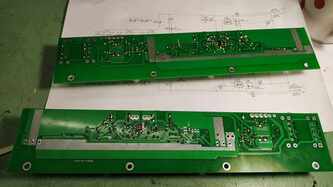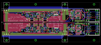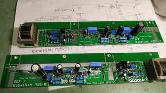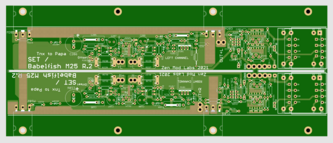 Yup, improved iteration of previously made Babelfish M25 Who remembers - 'twas bstrdzd FW M2 with implementation of XA25 main trick - Square Law arrangement of OS mosfets, in simpler words - mosfets in OS put to work without source resistors Result - looooow THD of OS, but main difference being broader A Class envelope , most prominent in context of 4R load - where regular M2 is KlunK!ing around 12-13W, while B. M25 doing the same around 40W ...... rest to max being KlunK! This pcb made for easy implementation of Schade arrangement for one OS mosfet, arbitrary chosen to do that with lower one, even if that is making some problems with choice of small mosfet for source follower/level shifter ....... I need one with lower Ugs treshold ( it adds to Schaded mosfet Igs) , and P channel small mosfets with that are scarce, somewhat Anyway, find enclosed both schmtcs, full one ( all parts on pcb populated) for SET (Schade Enhanced Thingie) and second - few parts omitted - for Babelfish M25 R.2 note - slight tweaks of THD Spectra, for one's Golden Ears, possible with change of output mosfets - down one can use either IRFP9140 or 9240, up can go IRFP240 or 150 about that later reminder - extensive ( if crude) explanation of biasing mechanismus posted in LuDEF thread , posts #32-#37, LuDEF Today - all files for Babelfish M25 R.2 ; anyway - read captions - each file is properly named and have caption1 poen