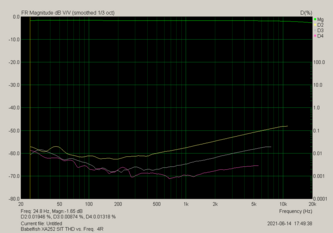 Posle više od godinu dana još jedna sitna modifikacija. Nikako nisam bio zadovoljan prevelikom količinom srednjih frekvencija. Moja sestra ima skroman sistem (SMSL B1 + modifikovan SONY TAN-15F + modifikovani WD11.1 + ASW100 SUB) i tu malo fali ekstrema u opsegu, a srednji malo iskaču, naročito kad se pojača. Bas sam rešio sa ASW100 jako dobro, a za ostalo sam morao malo da se pomučim. Kad sam prvi put radio, onda sam testirao zvučnike kod sebe u sistemu bili su OK, potom krenuše oni policijski časovi i slično te nije bilo vremena za još malo doterivanja. Sad sam malo prigušio viši srednji opseg te odvadio malo dampinga i mogu da kažem da merenje nije spektakularno, ali zvuk jeste za ove jeftine zvučnike (skoro pa izuzetan). Znači palo je fino podešavanje na uvce, a merenje je onako usput. Moram da pohvalim konstrukciju samih kutija, zaista ima malo vibracija i vrlo su čvrste što doprinosi čistoći zvuka. Upravo se testiraju u jednom Groznom sistemu na finim stalcima i Babuškama, a ja nemam nikakve stalke niti Babuške tako da su kod mene tokom testiranja bili malo uskraćeni što se tiče kvaliteta reprodukcije (skoro pa na patosu). Vrlo su osetljivi na pozicioniranje, i uslov je bio da bolje zvuče sa maskom nego bez nje, što sam nekako postigao. Na FR dijagramu: plavo je novo (mereno u poziciju sa slike), zeleno je fabričko stanje (mereno na sredini sobe). Što bi se reklo ne valja baš ni jedno ni drugo, ali fabrički ne mogu da se slušaju koliko si tupi i dosadni, a ovo zvuči ekstra veselo i dinamično. 3D prezentacija na stalcima je zaista sjajna, što je i za očekivati od malih zvučnika kad se pažljivo nameste u prostoru.3 poena