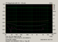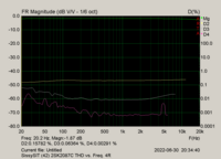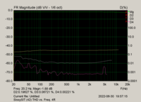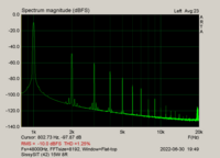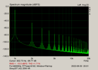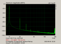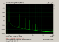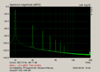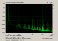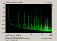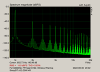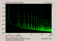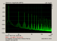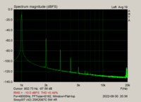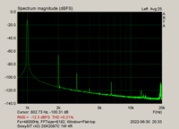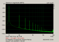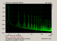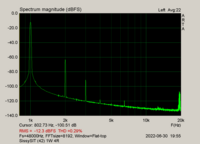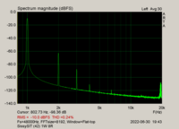 Now, battery of tests Will post same measurement of THF51S and 2SK2087C in same post, trying that THF51S is on left side pic; anyway, THF51S related are not having type note, while for 2SK2087C I remembered to include note in caption go figure general trend, already established in thread liniked in first post, small one is having lesser THD levels than big one, all the way to clipping , and small one is having lesser power than big one in all cases - dual rails, 24Vdc-ish, Iq 1A8-ish 1W@8R -
