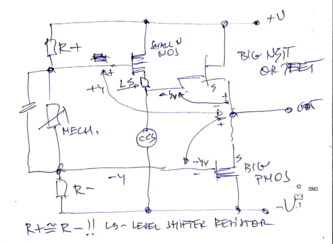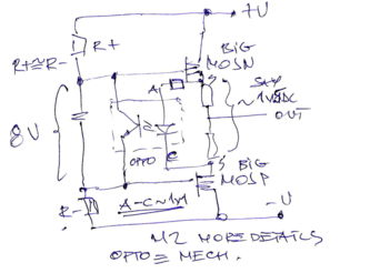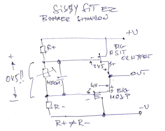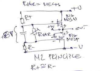 again, cap between two rail resistors, if using any of preceeding solutions with two mosfet gates ( one up, one down) we have symmetrical values of rail resistors, everything behaving nicely and polite and .......... almost boring