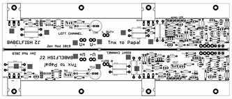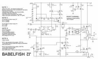 Babelfish ᄅſ Seeing some stones turned lately , I simply couldn't resist Babelfishing urge...... Though , as I already did some mild Babelfishing of our dear and beloved J2 , logically that this time I needed to do something ...... completely different due to constant demand and popularity mainly on Far and less Far East , schematic of original FW J2 is still generally unknown or - better said - none of circulating DIY schematics weren't blessed by Mighty Pa (pleonasm here , Pa is Mighty by 42) few things we all know , and these few things are good and plenty enough for basic postulates of variation of Jazz Standard Basic premises : 1. possibility of incorporating less critical ( for acquire) JFets for input LTP, by choice and must possible use of 1+1 , or 2+2 in same ; 2. possibility of incorporating various output devices , of lesser and bigger rarity and/or price 2a. possibility to avoid tearfully matched parts (outputs and other ) , while still easy settable both output offset and OS Iq in broad range of values I got it all ........ how: 1.easy peasy - use N channel JFets (choice is waste!) , lead them (currents) back to lower output gate via simple and effective current mirror ..... put few cascodes here and there to pet both JFets and fine CM parts (tiny JFets are always grateful for that, but high beta small BJTs like that too) ....... and while we are there - why not using fine emiter follower between CM final end and lower output's gate ....... 2. OK - trimpot in front of lower output's gate is trivial ; second part is feeding Optocoupler with CCS , with some current spare , and routing the same in loop around ( in parallel practically) said optocoupler , so we can set Iq of upper mosfet with ease and in broad range 2a.partly already covered above , just to add that output devices can be plain old IRFP150 , same as any boutique part you already have , value of Ugs is irrelevant - easily covered with change of ,say, two resistors 'nuff talking , time for schm (read notes on left side):